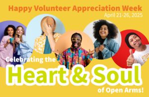 Volunteer Appreciation Week is HERE! April 21–26. At Open Arms, we believe our volunteers are the heart of everything we do—and this week, we’re pulling out all the stops to celebrate YOU. From raffles, kitchen-made treats, and trivia, to daily dress-up themes and staff windshield washes for our drivers—it’s going to be a week full of fun, gratitude, and community.